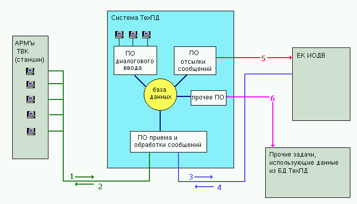 - Ответы из ИОДВ на всевозможные сообщения, как пришедшие из ТВК, так и посланных непосредственно из ПО ТехПД (5). Эти сообщения анализируются, необходимая информация из них отображается в базе (прошло сообщение или есть ошибки, переборы, недоборы и прочее). Если надо, то сообщение пересылается в ТВК, см. (2).